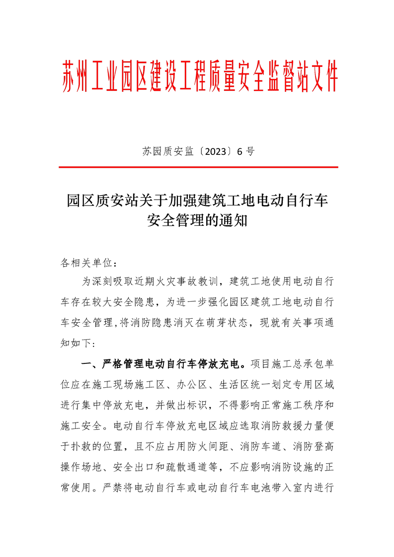 園區(qū)質(zhì)安站關(guān)于加強(qiáng)建筑工地電動自行車安全管理的通知