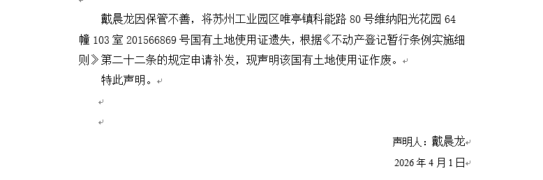 關(guān)于蘇州工業(yè)園區(qū)唯亭鎮(zhèn)科能路80號(hào)維納陽(yáng)光花園64幢103室201566869號(hào)國(guó)有土地使用證遺失聲明