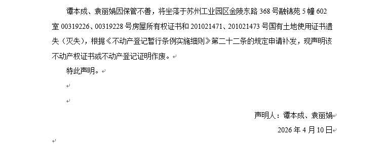 關于蘇州工業(yè)園區(qū)金陵東路368號融錦苑5幢602室00319226、00319228號房屋所有權證書和201021471、201021473號國有土地使用證書遺失聲明