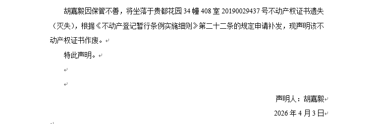 關于貴都花園34幢408室20190029437號不動產權證書遺失聲明
