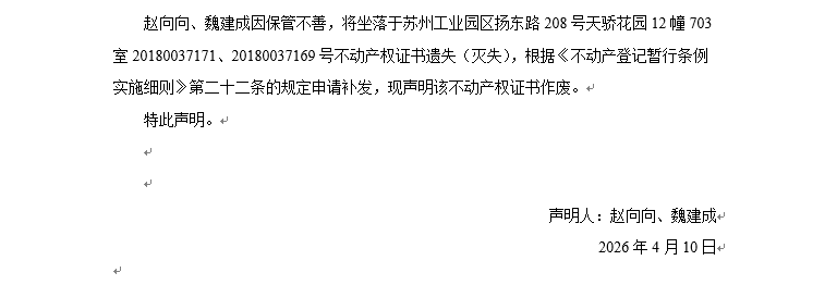 關于蘇州工業園區揚東路208號天驕花園12幢703室20180037171、20180037169號不動產權證書遺失聲明