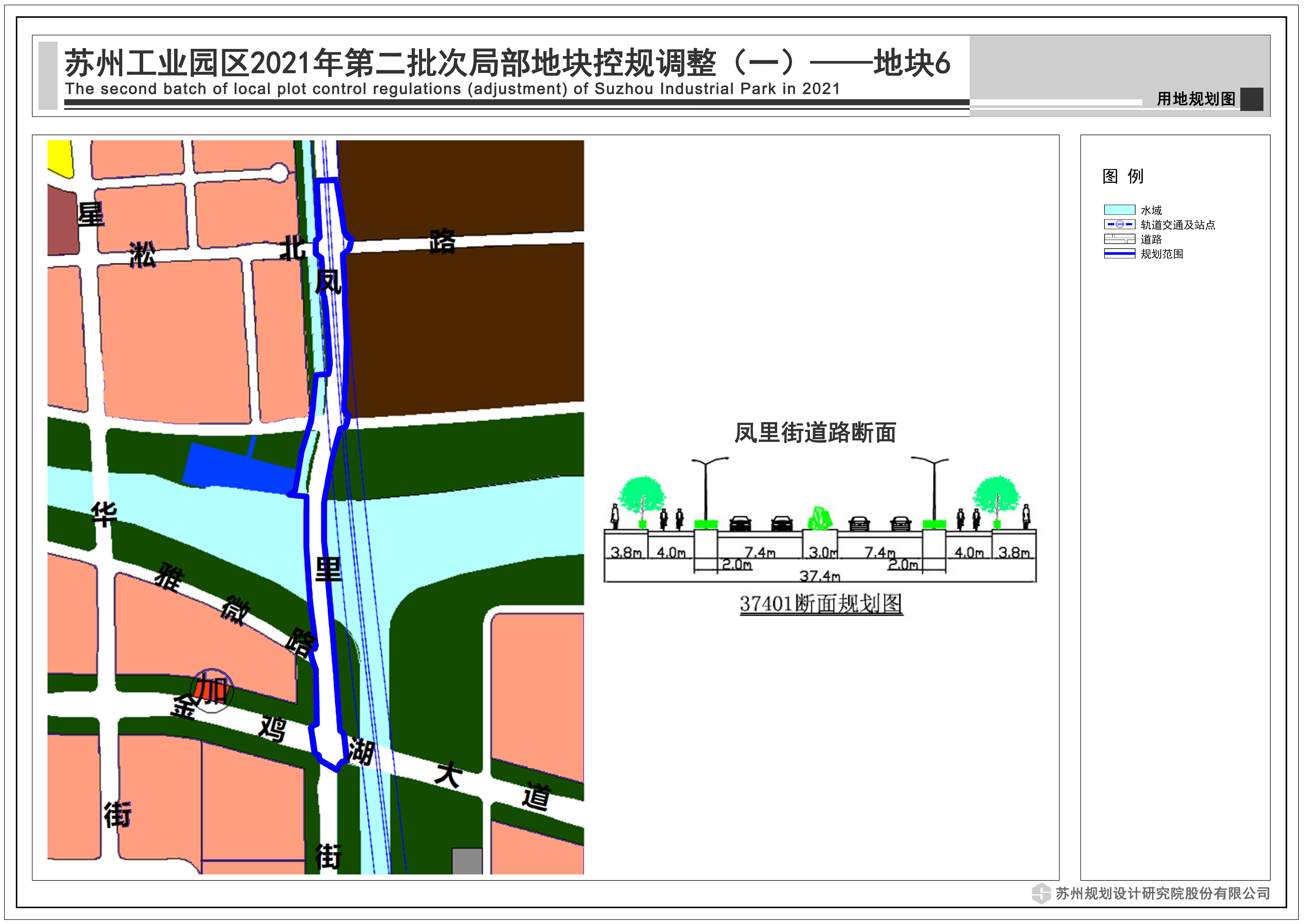 為進一步優化與通蘇嘉甬高鐵線等的關系,調整鳳里街南延線型,道路斷面采用37.4米標準斷面,雙向四車道;同時調整道路西側鳳里浦河道線型。