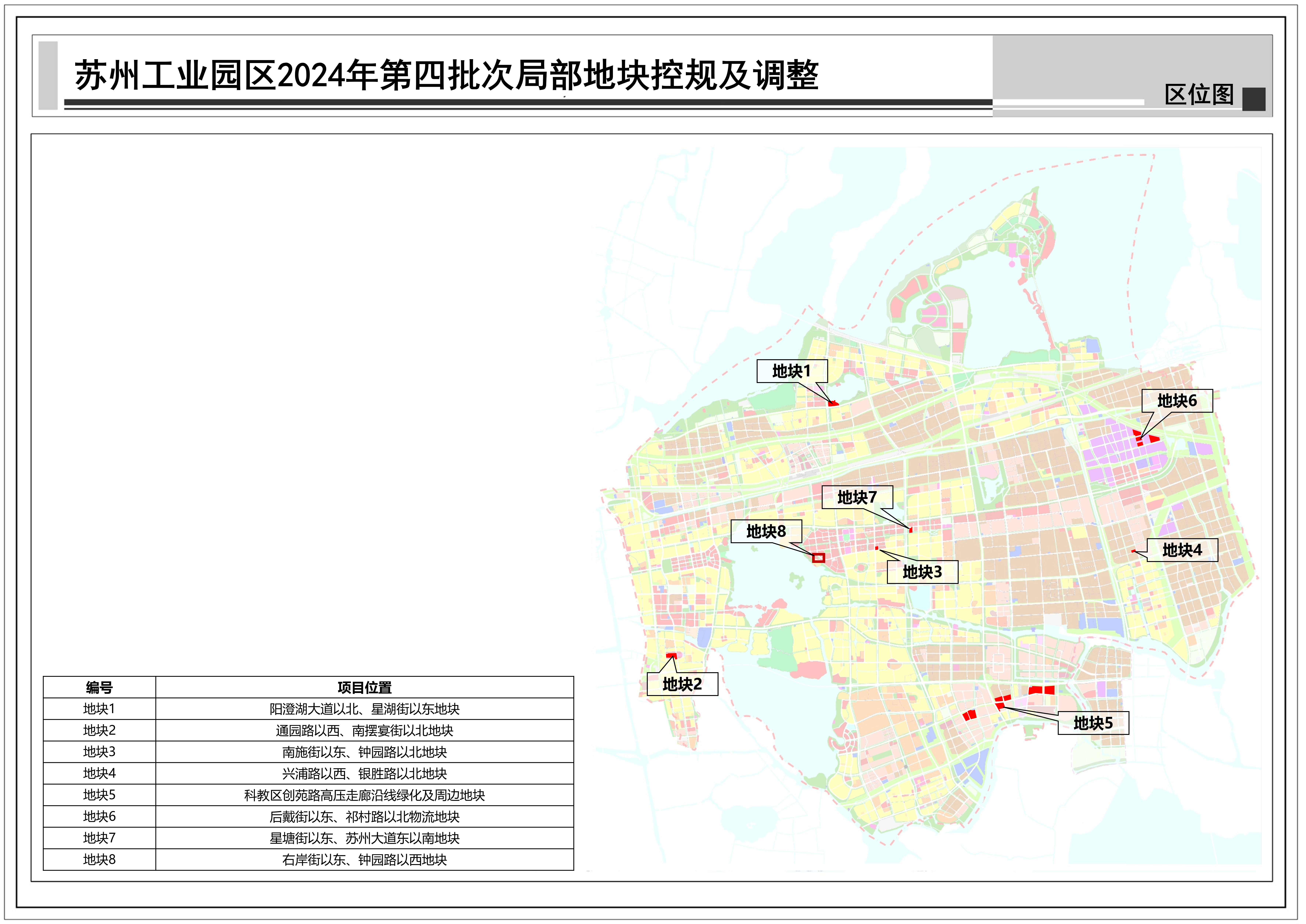 蘇州工業園區2024年第四批次局部地塊控規調整:共包括8個地塊,總用地面積約0.74平方公里,詳見附圖區位圖。