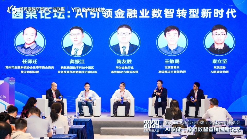 本次論壇還就《AI引領金融業數智轉型新時代》主題展開圓桌對話,深度探討數字化浪潮下AI大模型在金融行業的應用與挑戰,并針對當下金融機構數字轉型過程中普遍存在的問題給出建議。圓桌對話邀請蘇州市金融科技協會生態專委會委員、盈天地副總裁任師遷作為主持,螞蟻集團數字科技中國區業務發展部金融解決方案總監龔振江、華為金融行業高級解決方案架構師陶友勝、百度智能云高級解決方案架構師王敏晟、東吳證券AI首席架構師秦立堅4位嘉賓分別從GenAI大模型的應用下的不同角度分析探討金融數字化發展機遇。