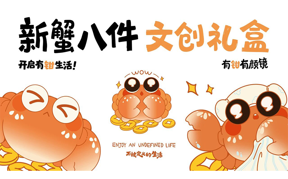 該作品以傳統“蟹八件”為靈感,打造了一套涵蓋毛絨掛件、健康錘、化妝鏡等八件蟹主題系列作品。運用“有鉗”諧音,衍生出“馬上有鉗、有鉗有好運、身體就是本鉗”等系列正能量口號,將美好的祝福融入日常生活的每個角落。
