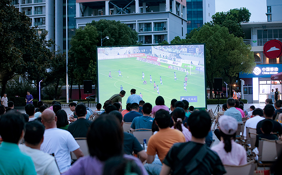 “開始了,開始了!”晚上7點,隨著蘇州隊迎戰(zhàn)揚州隊的哨聲響起,文星廣場的投影前爆發(fā)出陣陣歡呼聲。球迷們或坐或站,眼睛緊盯著屏幕上的每一次傳球、射門。每當有隊伍發(fā)起進攻,現(xiàn)場便掀起一陣聲浪。比賽開始一分多鐘,蘇州隊的率先進球更是在現(xiàn)場掀起第一波高潮。