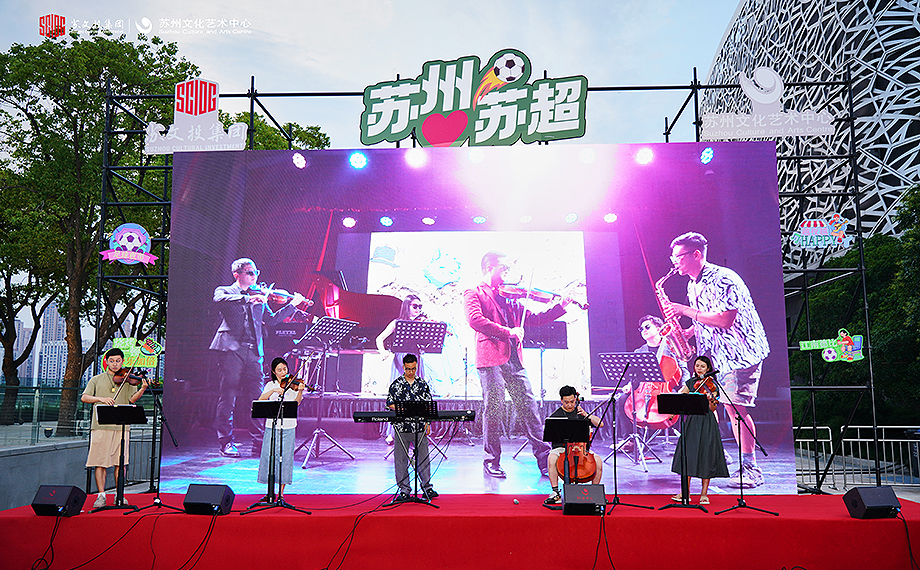目光轉(zhuǎn)向現(xiàn)代傳媒廣場、蘇州文化藝術(shù)中心湖濱廣場,球迷觀賽的“熱力值”同樣拉滿。作為夏夜市集頂流IP,傳媒之夜開啟“蘇超”模式,夜市云集40余家潮流“好市”,包括品牌餐飲、江南甄選、袞展文創(chuàng)等,滿足球迷看賽一切期待;足球魔方——籠式足球則讓市民體驗競技運動樂趣,在360°全圍擋的燈光籠中,快節(jié)奏攻防轉(zhuǎn)換不斷進行,街頭足球的即興創(chuàng)造力盡顯。而在蘇州文化藝術(shù)中心湖濱廣場,球賽的激情與多元文化的魅力交織,這里有豐富多樣的美食,熱愛生活、會玩有趣的生活藝術(shù)家,現(xiàn)場的演出更讓這個夏夜顯得與眾不同。
