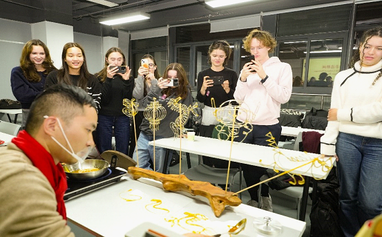 During the event, Li Yao, a fourth-generation inheritor of sugar painting techniques, gave the international students an introduction to the origin, development, spread and cultural connotations of sugar painting, and taught them to create patterns with this traditional handicraft.