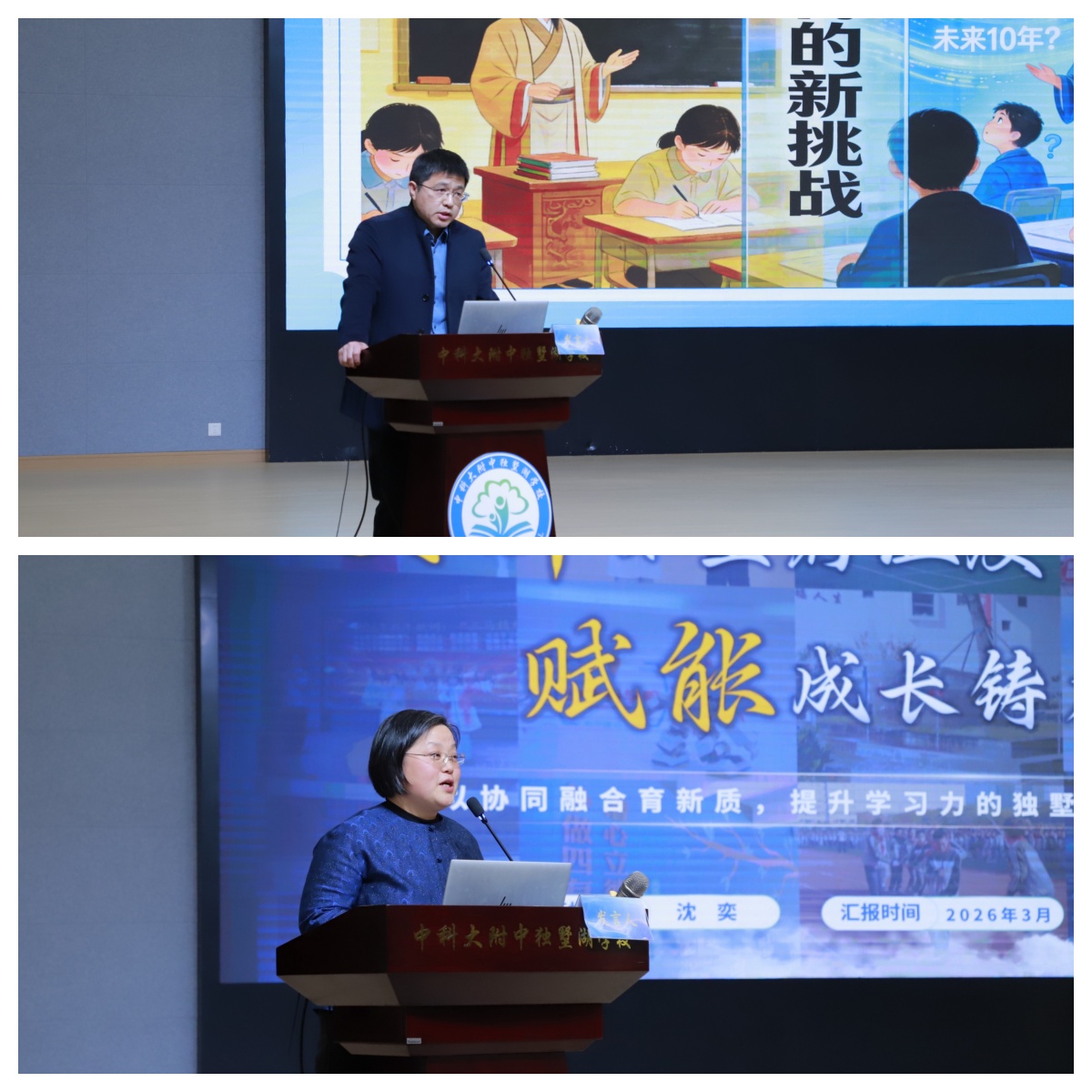 主題發言環節,蘇州工業園區星浦實驗中學書記劉長玉以“人智協同背景下學校育人系統性變革的實踐與思考”為題,分享了學校在人工智能與教育教學深度融合方面的創新舉措與階段成果。中科大附中獨墅湖學校副校長沈奕則以“煥新課堂存溫度,賦能成長鑄力量”為題,從提升學生學習力的視角,介紹了學校在課堂教學改革、特色主題活動、項目化引領及師資培養等方面的探索與實踐。